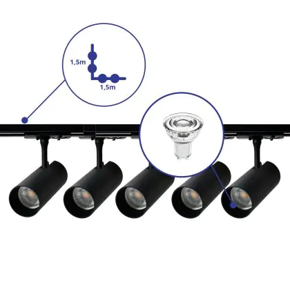 | Nome del fabbricante | Complete L shaped 1-Phase Track Set Black incl. 5x Spot fixture + GU10 2700K 3W Dim – 1,5 x 1,5 mete | |