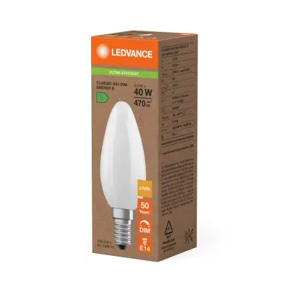 La lampada Ledvance Classic LED E14 Candela Ghiaccio 2.5W 470lm - 827 Bianco Molto Caldo | Dimmerabile - Sostitutiva 40W è il sostituto perfetto per le tue vecchie lampade 40W con attacco a vite piccolo E14 grazie alla sua tecnologia LED. Passare a LED ti offrirà molti vantaggi!