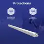 Questo apparecchio può essere usato sia in spazi interni che in spazi esterni, poiché ha indice di protezione contro l'ingresso di acqua e polvere IP65. In generale, un apparecchio con IP44 è resistente a schizzi di acqua e umidità, e può quindi essere installato in spazi esterni molto umidi o esterni riparati, come sono una tettoia. Un apparecchio che invece verrà esposto a intensi getti di acqua deve avere almeno IP54. Questa lampada ha anche un indice di resistenza a urti e impatti di IK10 - 20 Joule.