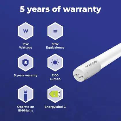 Il Noxion Tubo LED T8 Avant Extreme (EM/Mains) High Output 13W 2100lm - 827 Bianco Molto Caldo | 120cm - Sostitutiva 36W è l’alternativa perfetta per il tubo fluorescente standard 36W nelle plafoniere con un reattore. Con questo tubo LED hai una garanzia di una vita media utile molto lunga e 5 anni Lampadadiretta.it di totale garanzia. .