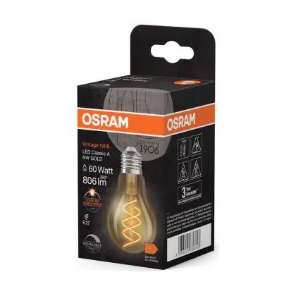 La Osram Vintage 1906 LED Classic Slim E27 Pera Filamento Oro 8W 806lm - 922 Bianco Molto Caldo | Miglior Resa Cromatica - Dimmerabile - Sostitutiva 60W è la perfetta sostituzione per la tua lampada convenzionale 60W con attacco E27 grazie alla sua tecnologia LED. Passare a LED ti offrirà tanti vantaggi!