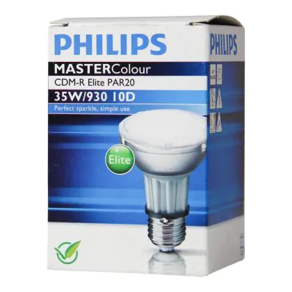 Le Philips CDM-R Elite 35W 930 E27 PAR20 10D (MASTERColour) sono lampade a scarica compatte ad alogenuri metallici in ceramica dotate di riflettore. Sono lampade estremamente efficienti che presentano una potenza di 35W e sono dotate di attacco del tipo E27. Queste lampade a scarica compatte hanno una vita media di 15000 ore. La resa dei colori é eccezionale grazie all'indice di resa cromatica di 90-100Ra: questo sta ad indicare che le caratteristiche degli oggetti illuminati sono poste in risalto in maniera ottimale.